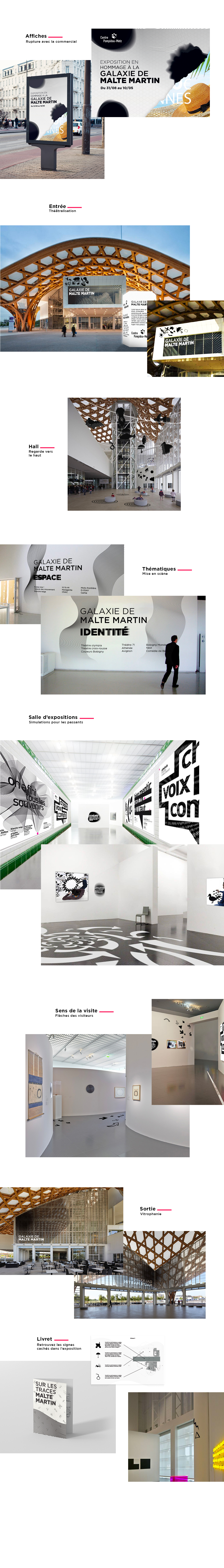 Ce projet rend hommage à Malte Martin en créant la signalétique du Centre Pompidou-Metz à son image. L’approche cherche à faire du graphisme un outil vivant et social, guidant le visiteur tout en laissant une empreinte claire, engagée et interactive, fidèle à son travail dans l’espace public.